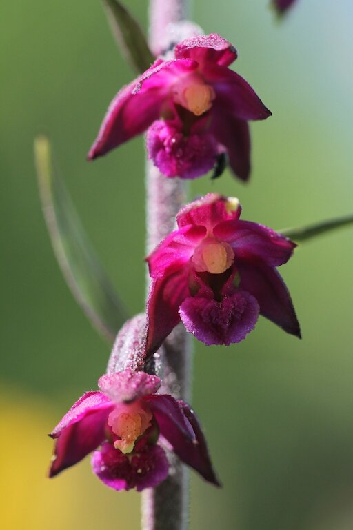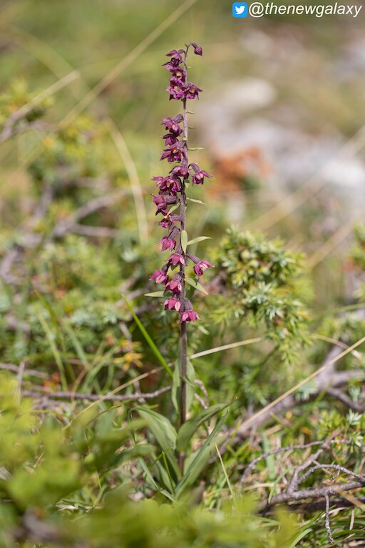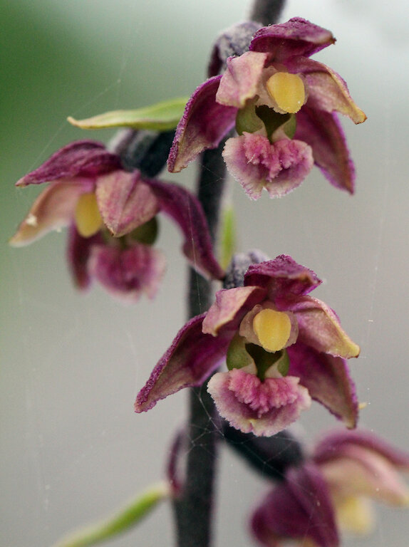 • Many Dark-red Helleborines, their unusual colour variations that abound here, and Epipactis x schmalhausenii, the rare hybrid with Broad-leaved Helleborine