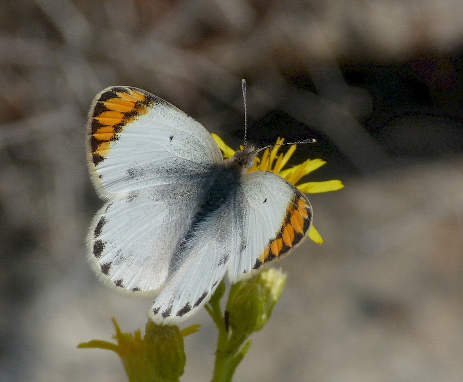 Further to the east, the striking Desert Orange Tip Colotis evagore, is present along the rocky coastline where its larval host plant, caperberry, can be found.