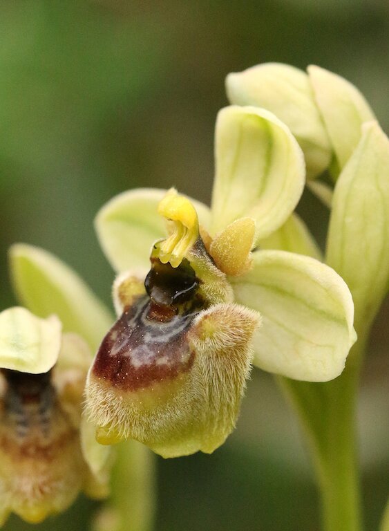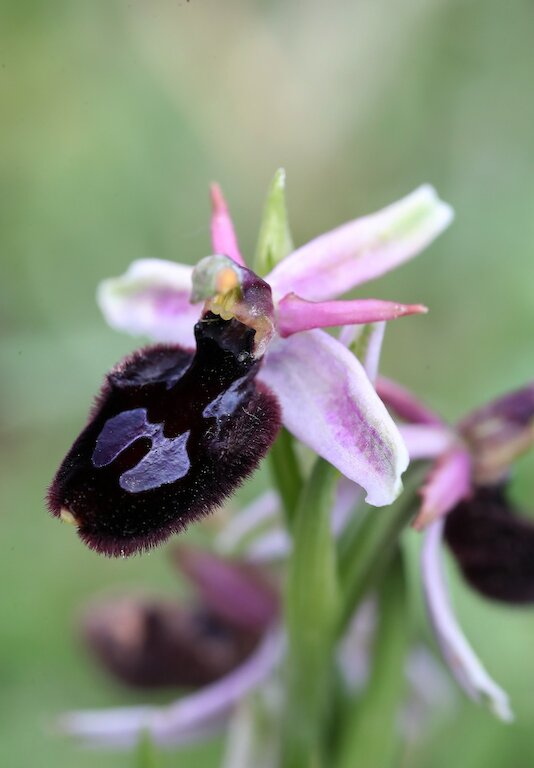 For the first part of the week we will explore the southwestern part of the Gargano. This area is largely rocky calcareous pasture mixed with scrub where the grassland is decorated with patches of bright Pink Butterfly Orchids Anacamptis papilionacea, the stunning sawfly orchid Ophrys neglecta, one of the best of the genus, and sprawling clumps of the deep blue Dyer's Alkanet Alkanna tinctoria. Near the ancient monastery of Santa Maria di Pulsano a spectacular gorge is home to the range restricted Adriatic Bellflower Campanula garganica and, clinging tenaciously to rocky cliffs, Hairy Golden-Drop Onosma echioides. Here we may come across the spectacular endemic Ophrys sipontensis. The abundant flowers here attract butterflies like Scarce Swallowtail Iphiclides podalirius, Eastern Bath White Pontia edusa, and Adonis and Chapman's Blues Polyommatus bellargus and P. thersites. The bright orange flowers of Field Marigold Calendula arvensis are a favourite for the tiny colourful beefly Usia versicolor.