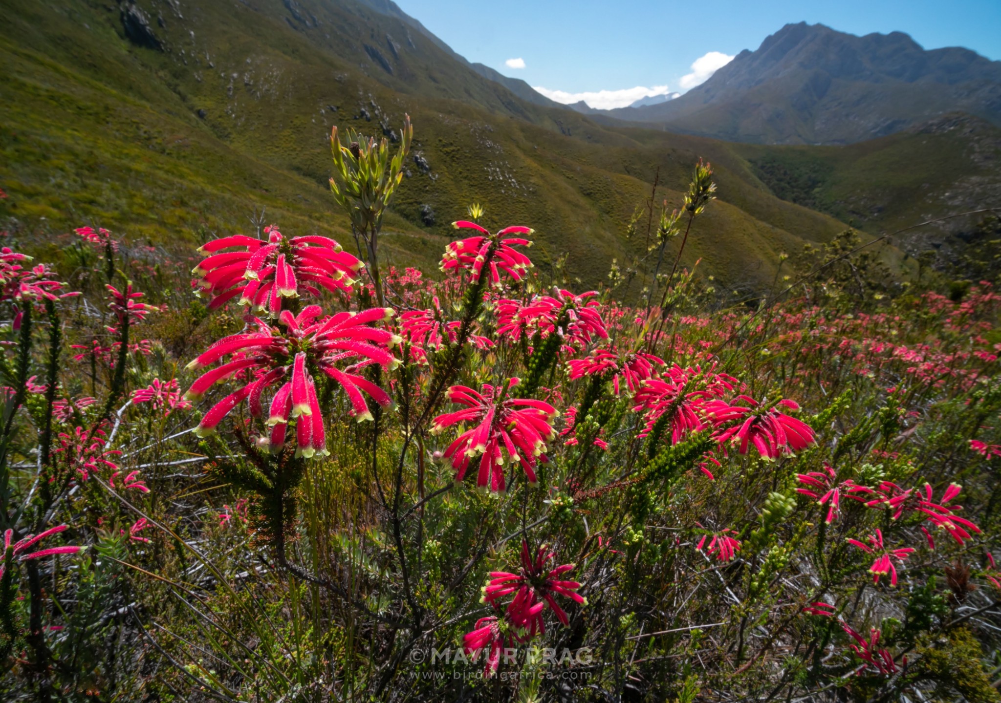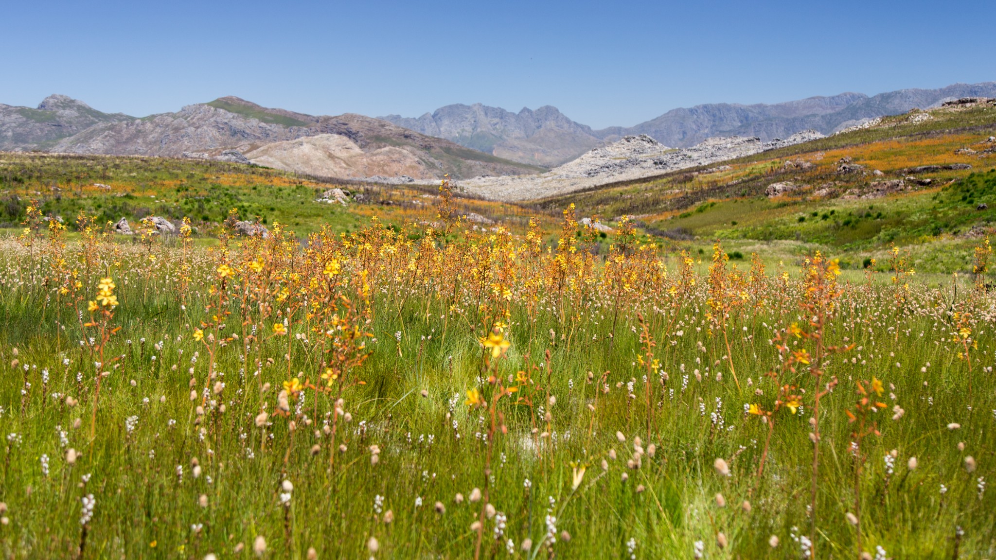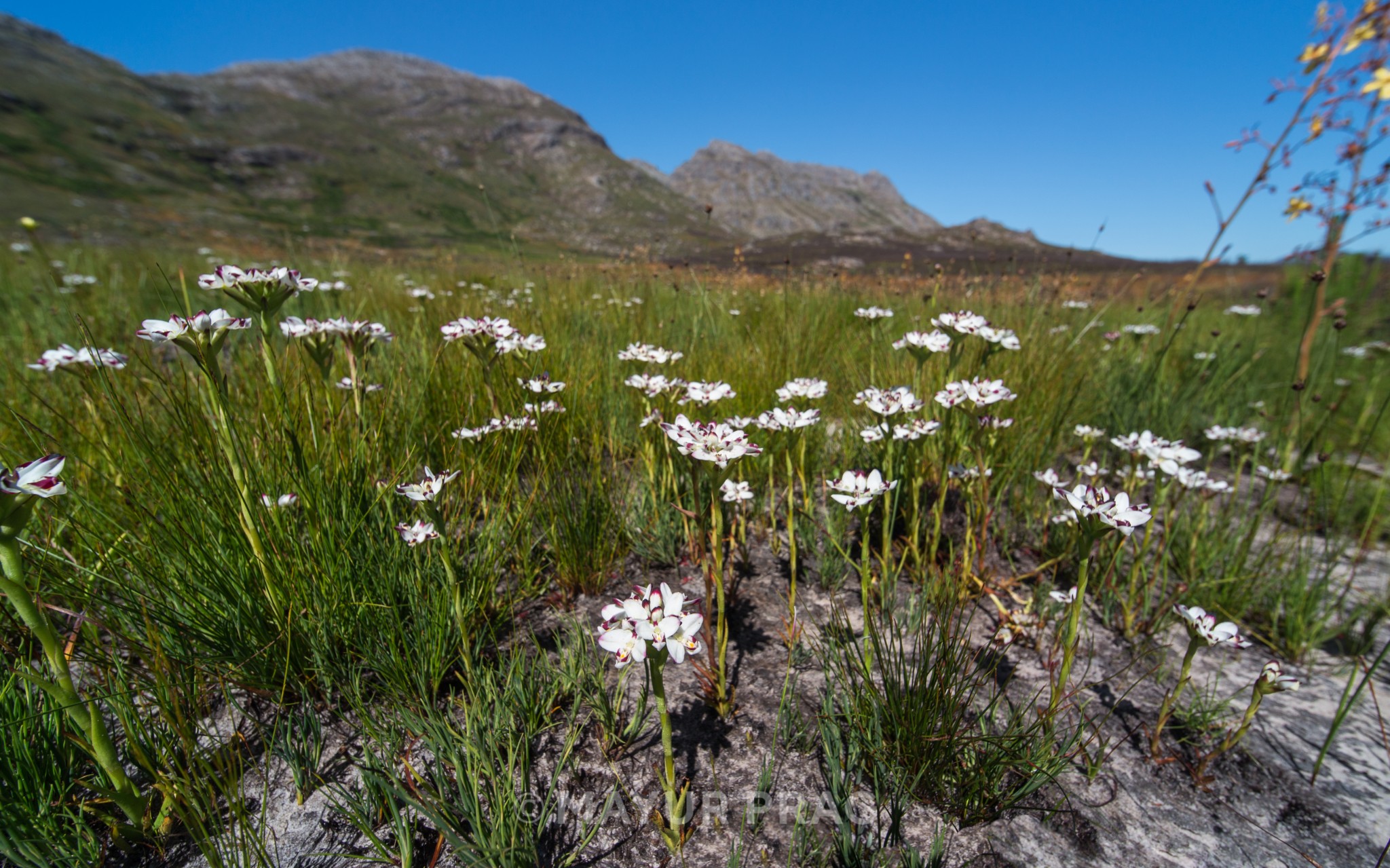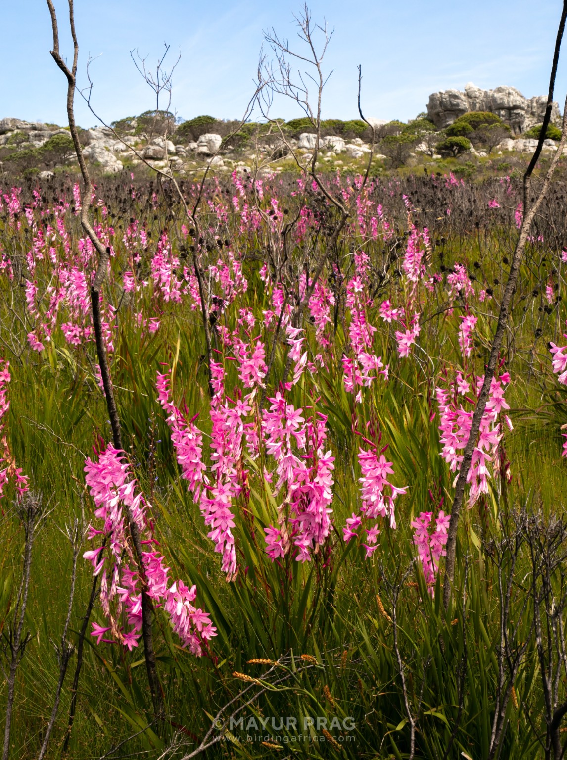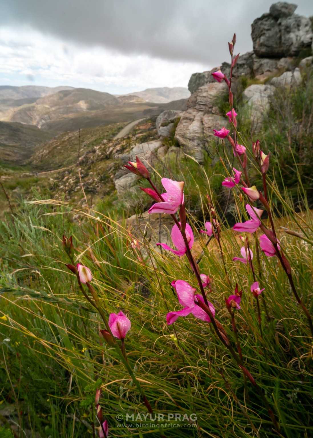 As midsummer hits in the Cape, the lowlands which fill with spring annuals dry up and it is the uplands' turn to shine. Most prominent among the special flora are the orchids, many flowering in meadows and seeps recovering from fires the previous season. They form a dazzling array of shapes and colours, each with its unique pollination system. Nearby, a whole suite of often overlooked summer flora blooms, from irids such as Gladiolus and Tritoniopis, to the more characteristic Proteas and Ericas of the Cape.