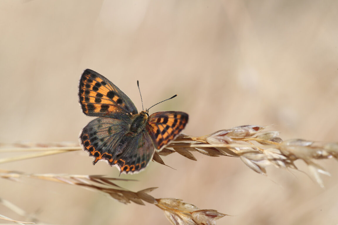 Before departing the Montes Universales we will also visit sites where we know we can expect early examples of Iberian Sooty Copper Lycaena bleusei, an endemic to the Iberian Peninsula and, arguably, one of the most beautiful of all the copper family, sporting gorgeous, rich bronze tones when freshly emerged. Other desirable butterflies on the wing at the time include the likes of Spanish Festoon Zerynthia rumina, Provence Orange Tip Anthocharis euphenoides, Western Dappled White Euchloe crameri, Large Tortoiseshell Nymphalis polychloros, False Baton Blue Pseudophilotes abencerragus, and Panoptes Blue Pseudophilotes panoptes.